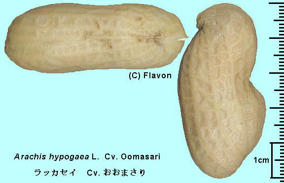 Fabaceae (Leguminosae) マメ科 Arachis hypogaea L. Cv. Oomasari Pod (Fruit) Cultivated in Yachimata city, Chiba, Japan S - 499 ラッカセイ Cv. おおまさり 豆果・種子 千葉県八街市 栽培 Oct. 29, 2008 千葉県農林総合研究センター育成品種 子実が柔らかく、甘みがあり、ゆで豆に適する 大きさは、ゆで豆用品種「郷の香(さとのか)」の約2倍 収量は10アール当たり880キロで 「郷の香(さとのか)」の1.3倍以上 | ![]() |